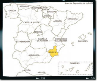 Más del 98% de sus efectivos se encuentran en su Comunidad de origen, Murcia, habiéndose localizado la existencia de dos pequeños lotes de hembras en Andalucía y en Cataluña.