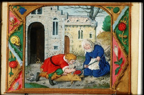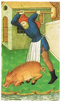 Calendario medieval en el que puede verse un hombre y una mujer sacrificando a un cerdo.