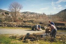 Descuartizando al puerco en Villafranca de la Sierra (Ávila). Artesa de matanza en el suelo.
