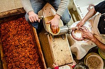 El picado de la carne se realizaba el día después, ya que prácticamente la totalidad del cerdo se dejaba colgado de una viga, oreando, a resguardo de perros y alimañas, en la parte baja de un frío almacén bien ventilado durante la noche posterior a su sacrificio.