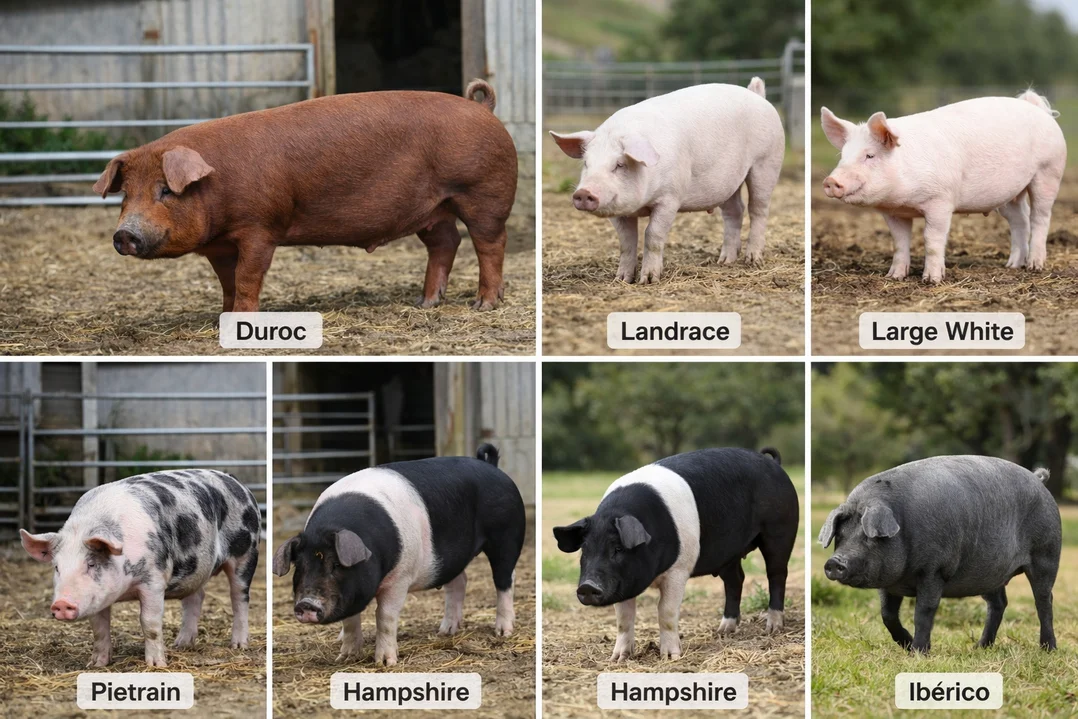 Dentro del porcino industrial, razas como Landrace y Large White suelen utilizarse como base maternal por su prolificidad, su buena aptitud para la cría y su funcionalidad en explotación. Por otro lado, razas como Duroc, Pietrain o Hampshire se emplean con frecuencia como líneas paternas por su capacidad para transmitir cualidades ligadas a la producción de carne, al rendimiento de canal y al desarrollo muscular.