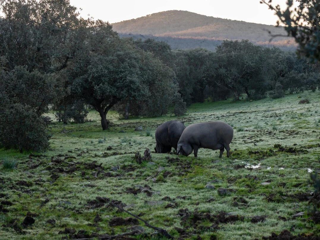 Estas áreas ofrecen el ecosistema ideal para la cría extensiva del cerdo ibérico, basado en el aprovechamiento de pastos naturales y recursos del entorno.